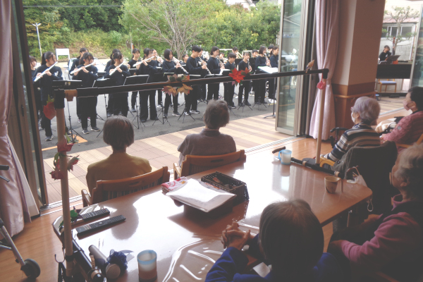 11月1日土曜日に我孫子市立白山中学校の吹奏楽部の皆さんが演奏会を開催しに来て下さいました。デイケアの利用者様は心待ちにしていたので、演奏と歌に心を打たれ感動していました。