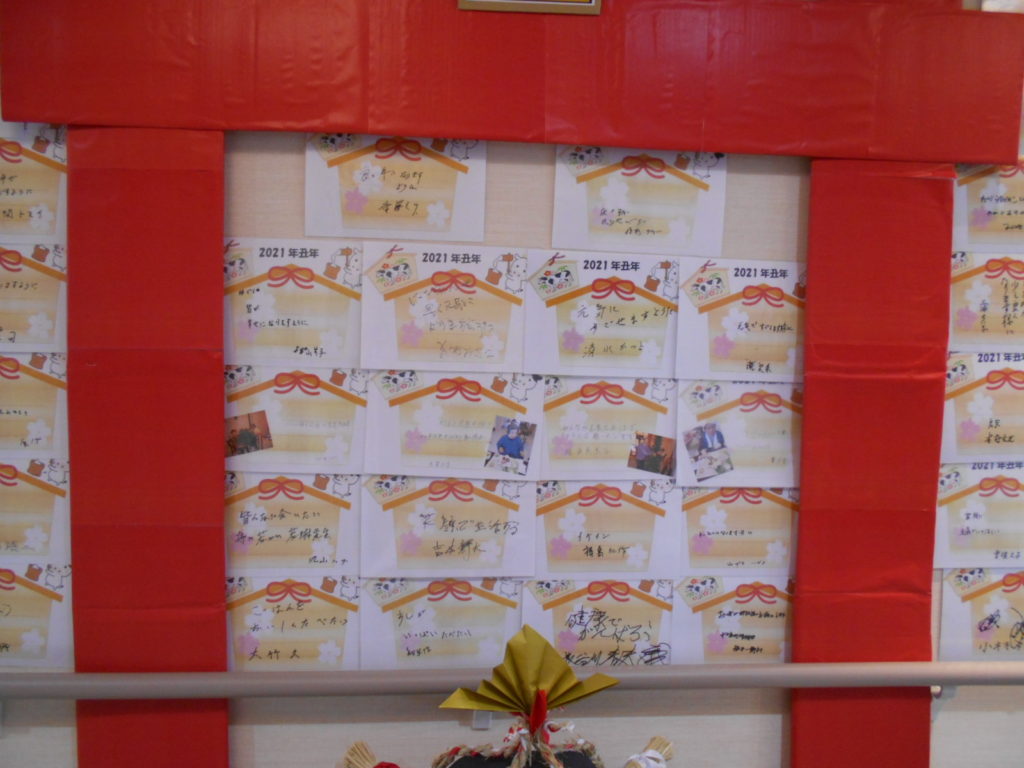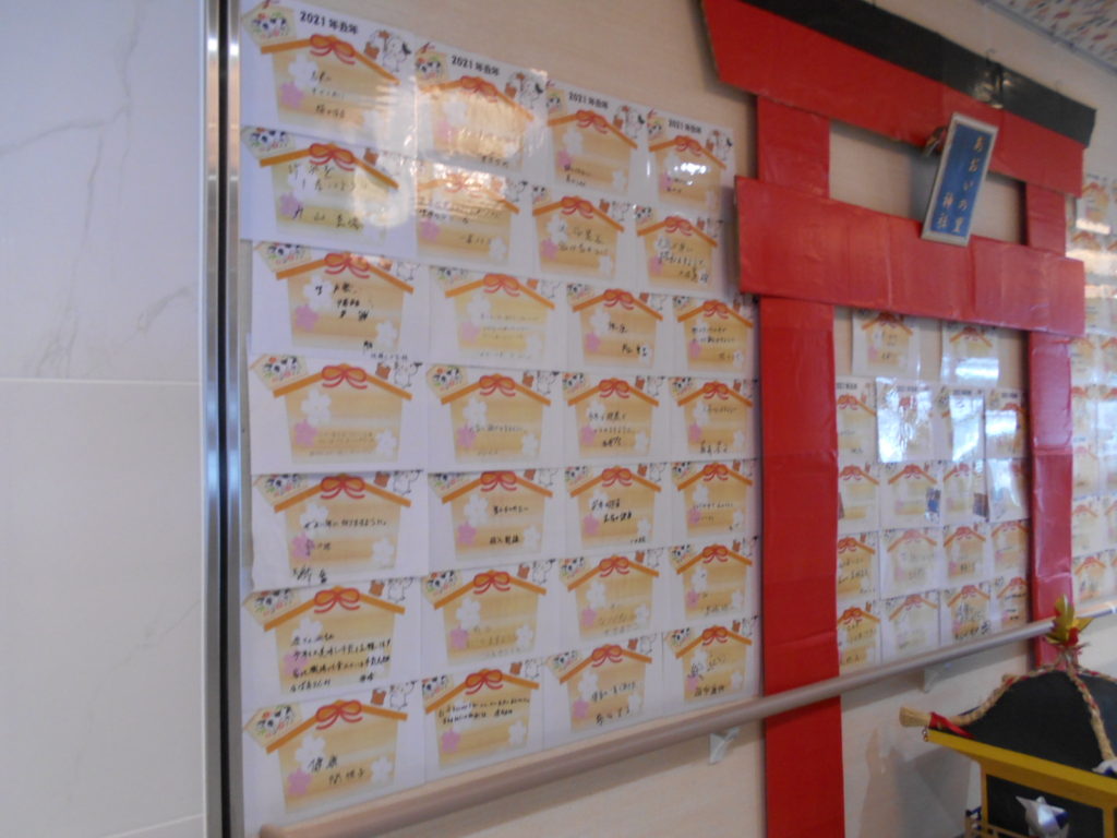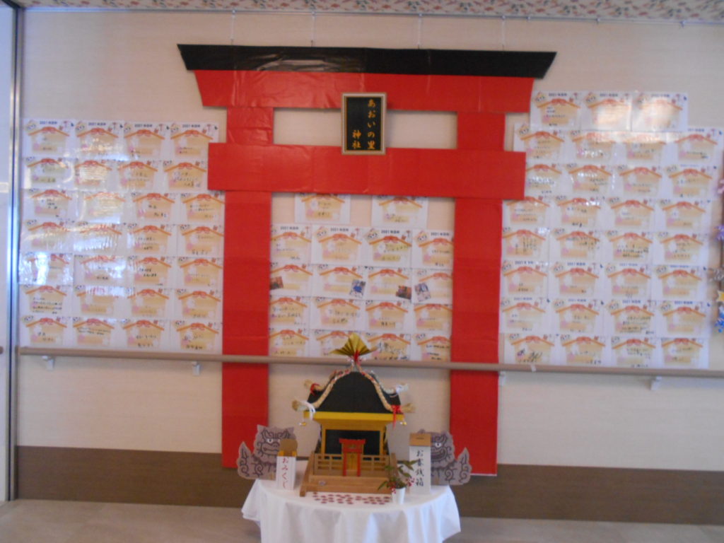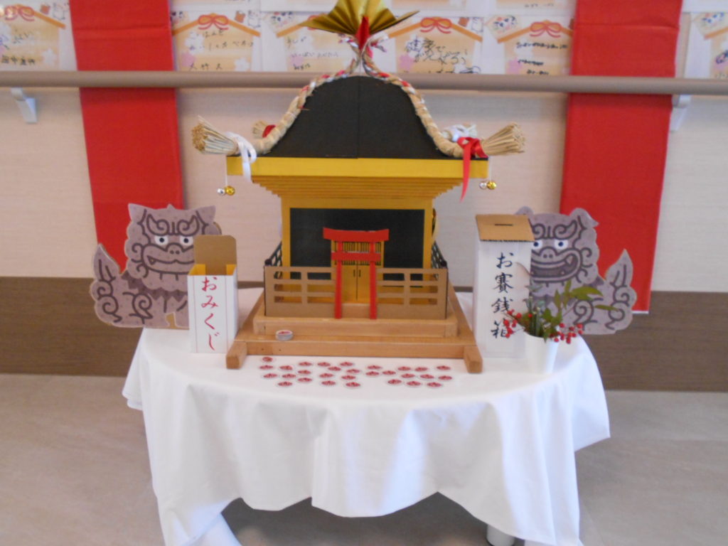 お賽銭箱とおみくじも用意し、鳥居の周りには利用者様にご記入いただいた絵馬を飾りました。