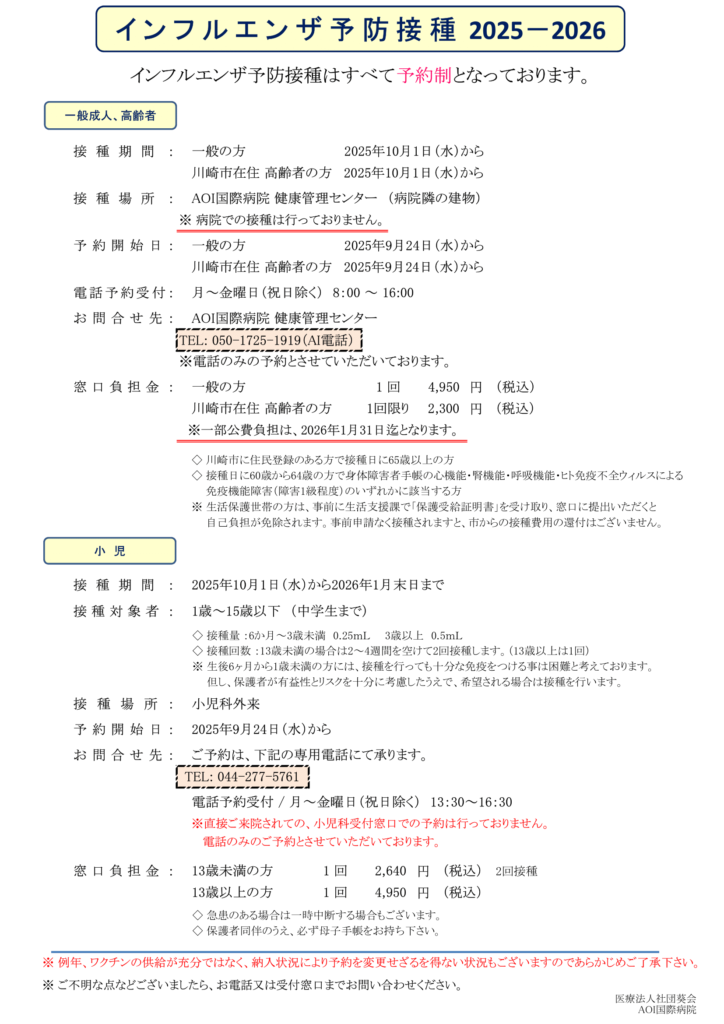 インフルエンザ予防接種のご案内≪全体≫ 2025年09月19日 2025年10月1日(水)よりインフルエンザ予防接種を予約制で実施いたします。 9月24日(水)より予約の受け付けを開始いたします。詳細はこちらをご確認ください。
