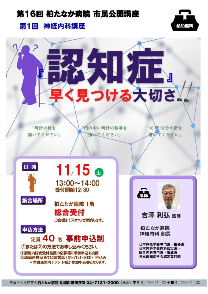 11/15(土)13:00-14:00 神経内科 吉澤医師による市民公開講座を開催します。