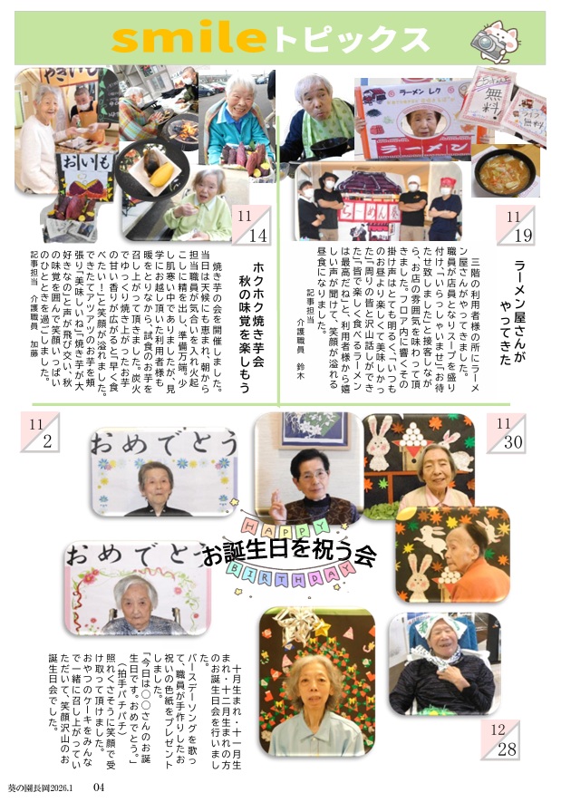 新着情報 HOME葵の園・長岡 広報誌「smile letter Vol.4」を発行しました。 葵の園・長岡 広報誌「smile letter Vol.4」を発行しました。 2026年01月07日 PDFでのダウンロードは最下部のバックナンバーからどうぞ。 バックナンバー smile letter Vol.4 smile letter Vol.3 smile letter Vol.2 smile letter Vol.1