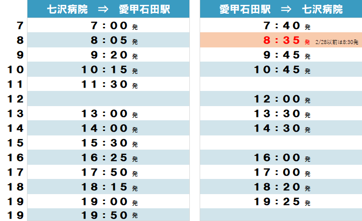 3月1日より、愛甲石田→七沢病院の8:30発が8:35発へ変更されます。