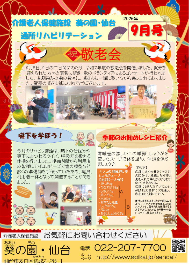 また、通所リハビリテーション広報誌(2枚目)では、歌のボランティアによる心に響くコンサートや、安全なお食事に役立つ嚥下に関するリハビリ講話の様子を掲載しております。さらに、食欲の秋にぴったりの季節のおすすめレシピもご紹介。ご自宅での健康維持にお役立てください。