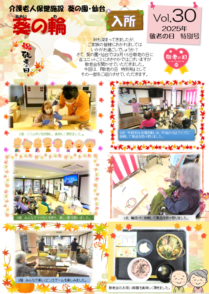 入所の広報誌(1枚目)では、歌やゲームで大いに盛り上がった敬老会の賑やかな様子をご紹介。利用者様の笑顔あふれる素敵な瞬間をお届けいたします。