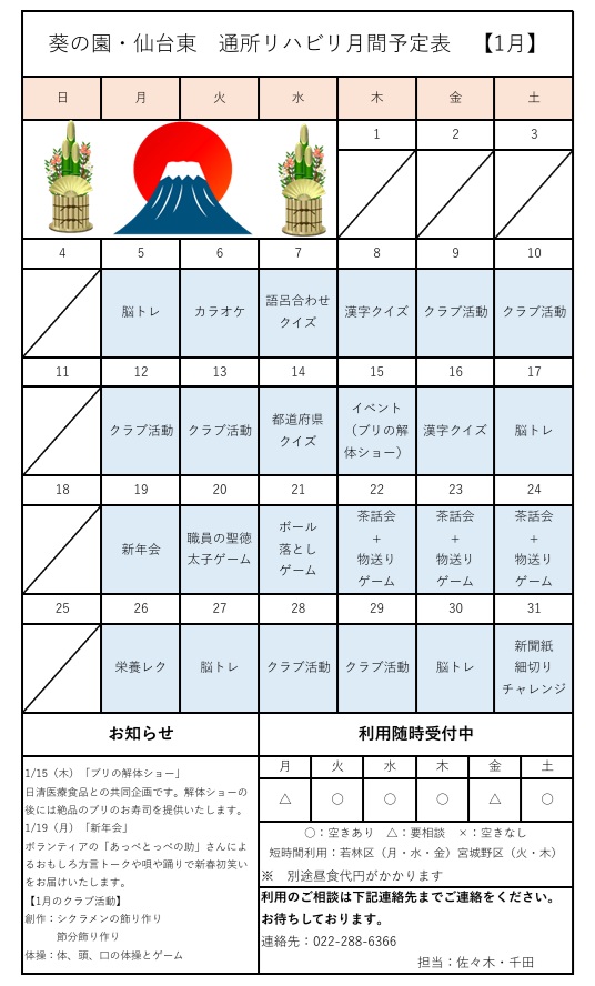 通所リハビリ月間予定表【1月】