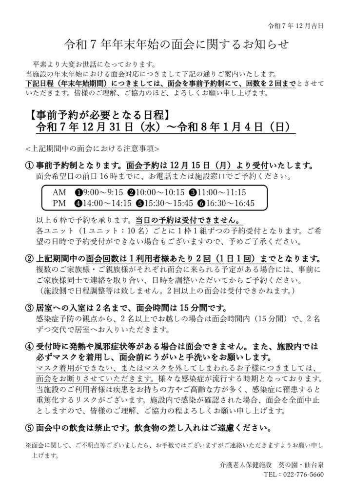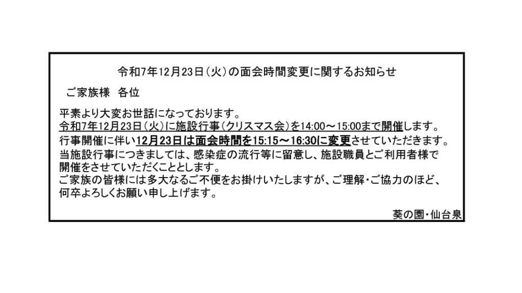 令和7年年末年始の面会に関するお知らせ、12/23面会時間変更のお知らせ