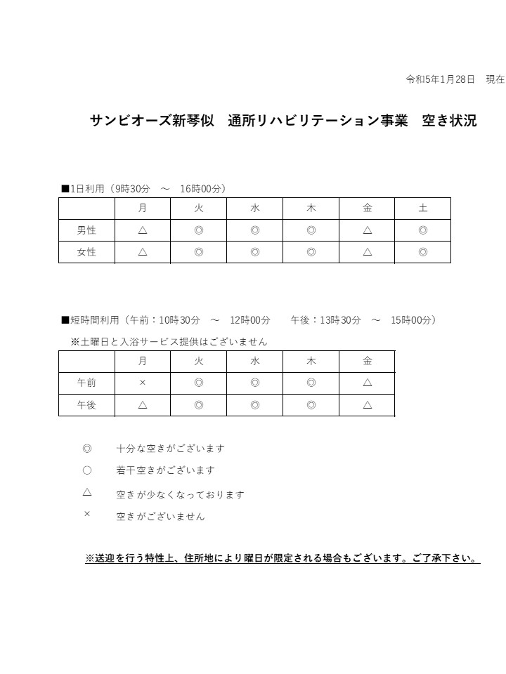 通所リハビリテーション事業 2月の空き状況について