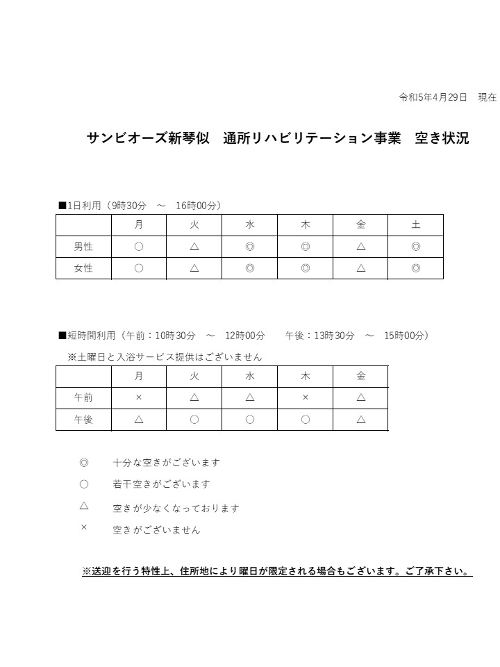 通所リハビリテーション事業 5月の空き状況について