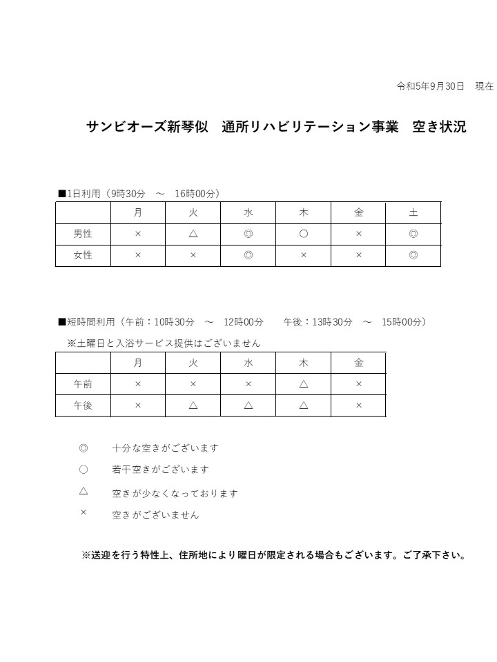 通所リハビリテーション事業 10月の空き状況について