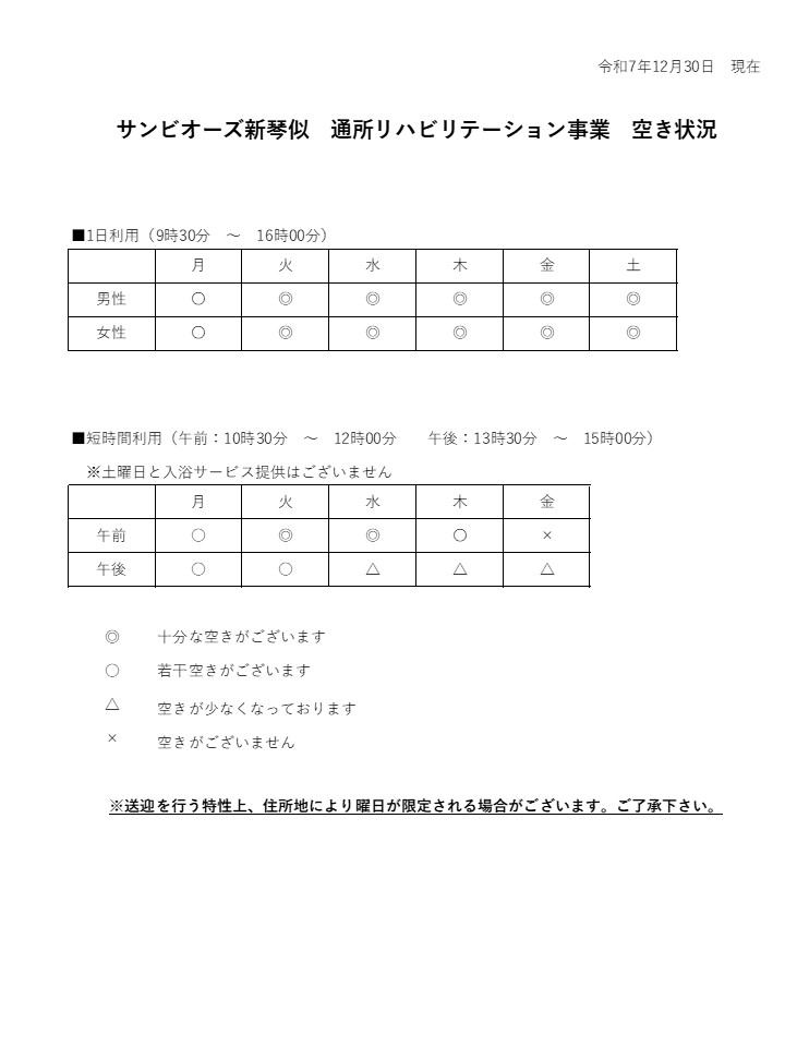 通所リハビリテーション事業 1月の空き状況について